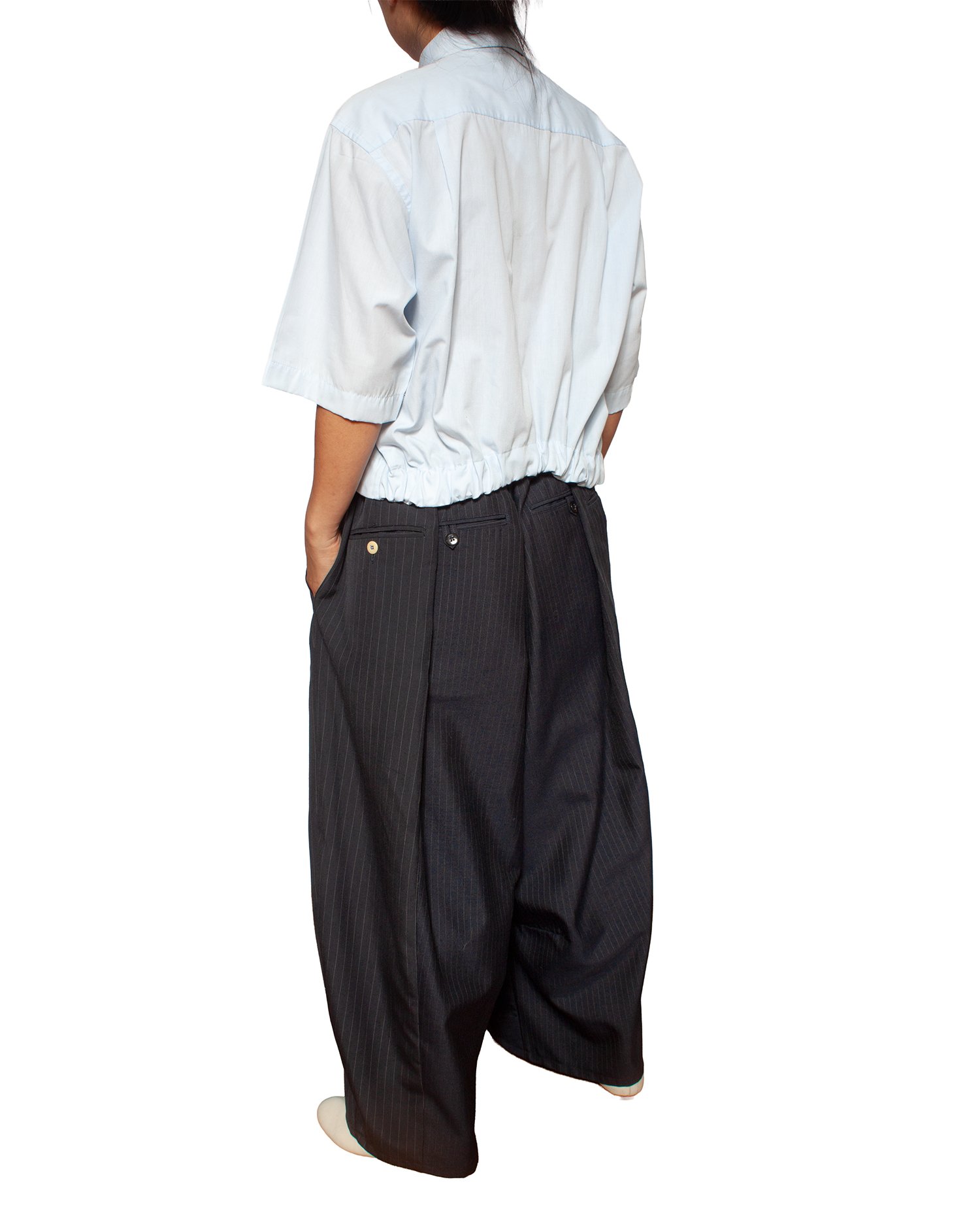 Camisa cropped manga curta com bolso e elástico na cintura nas costas