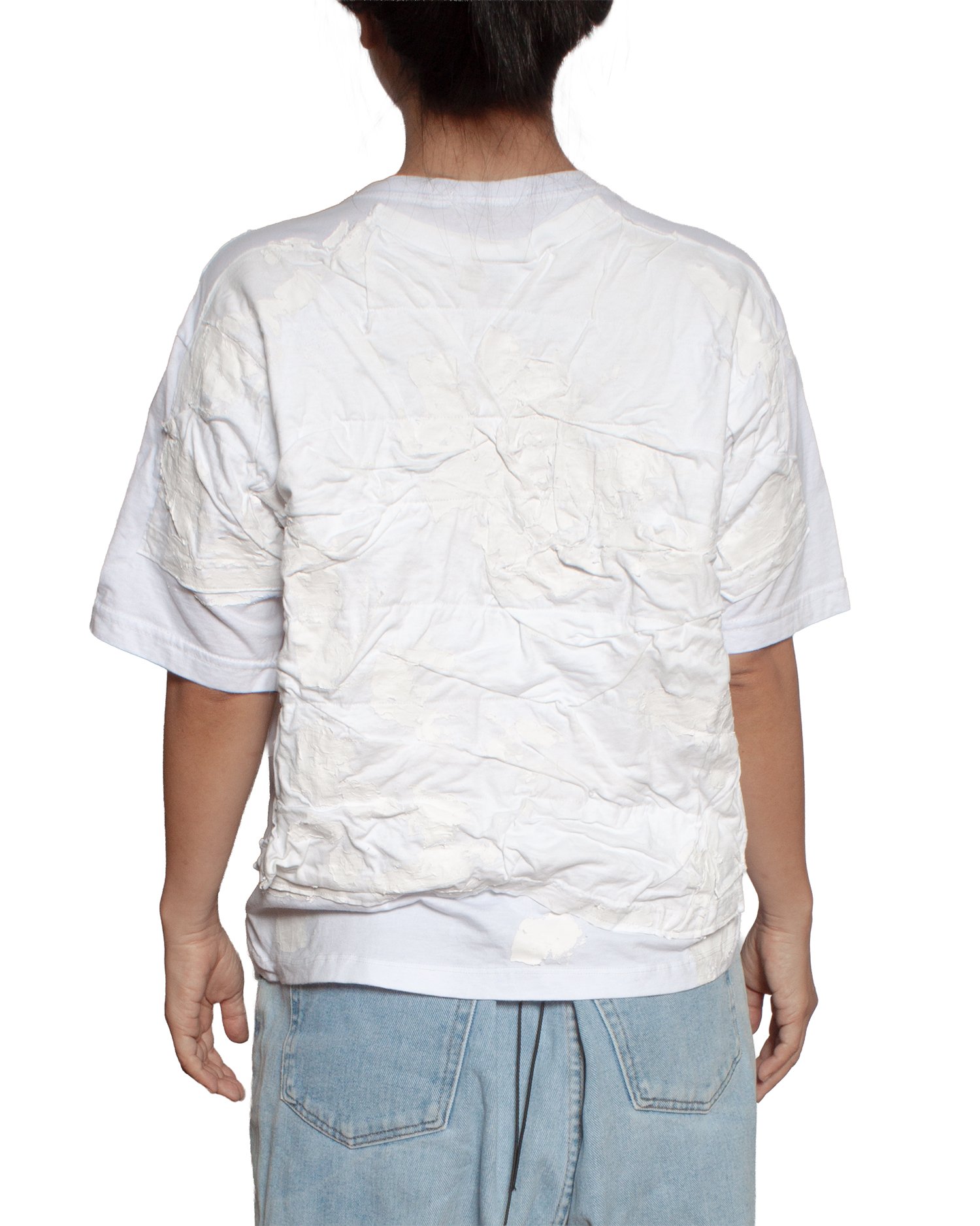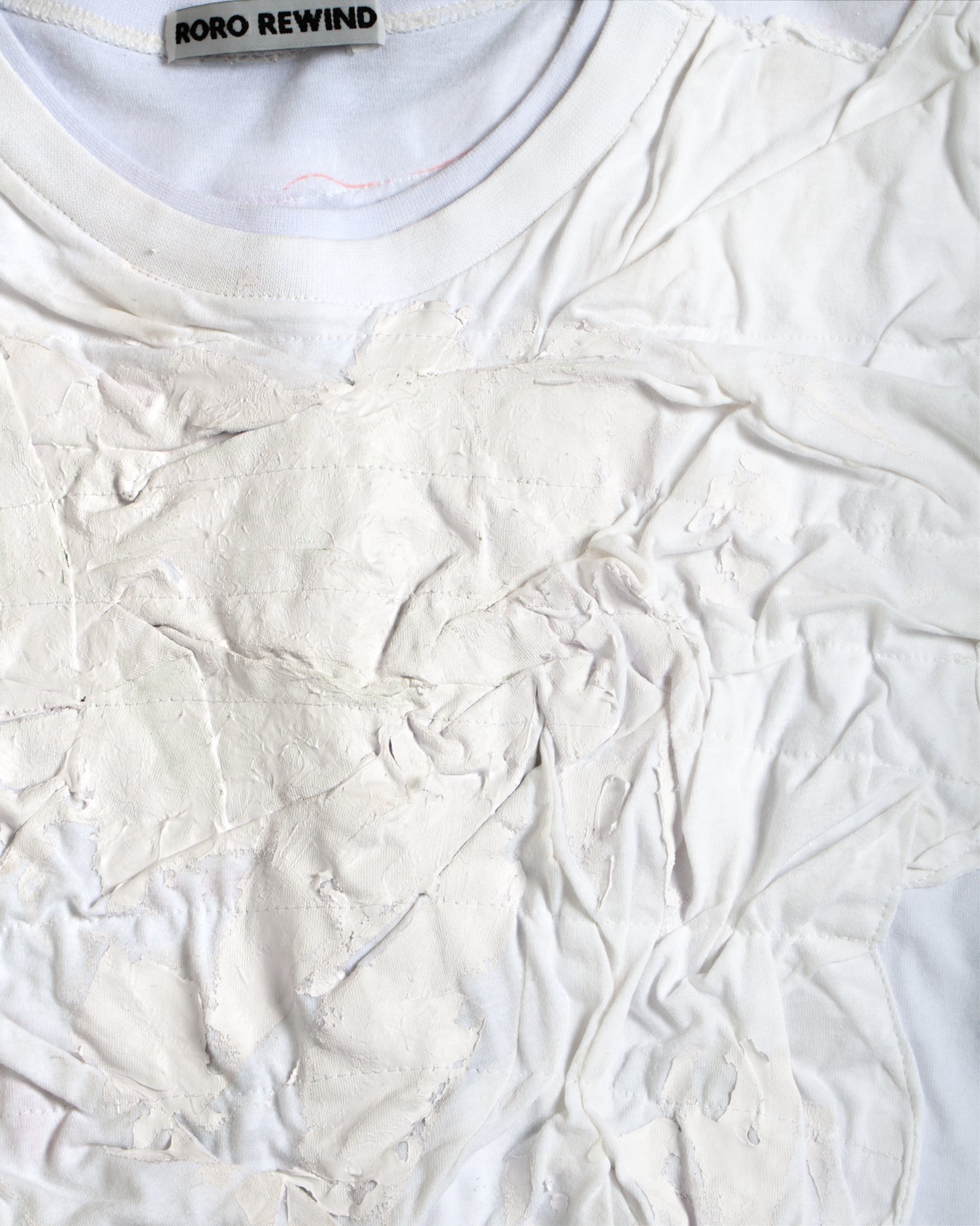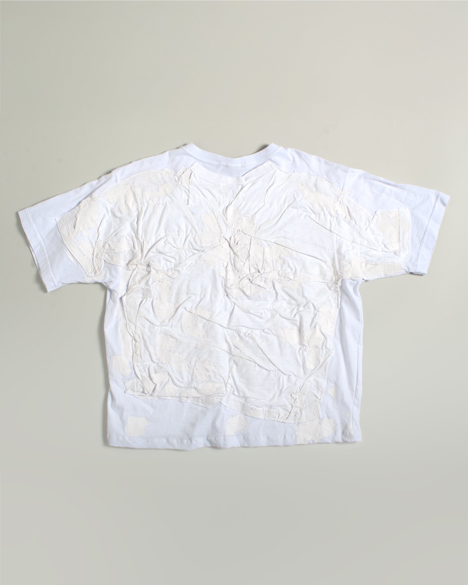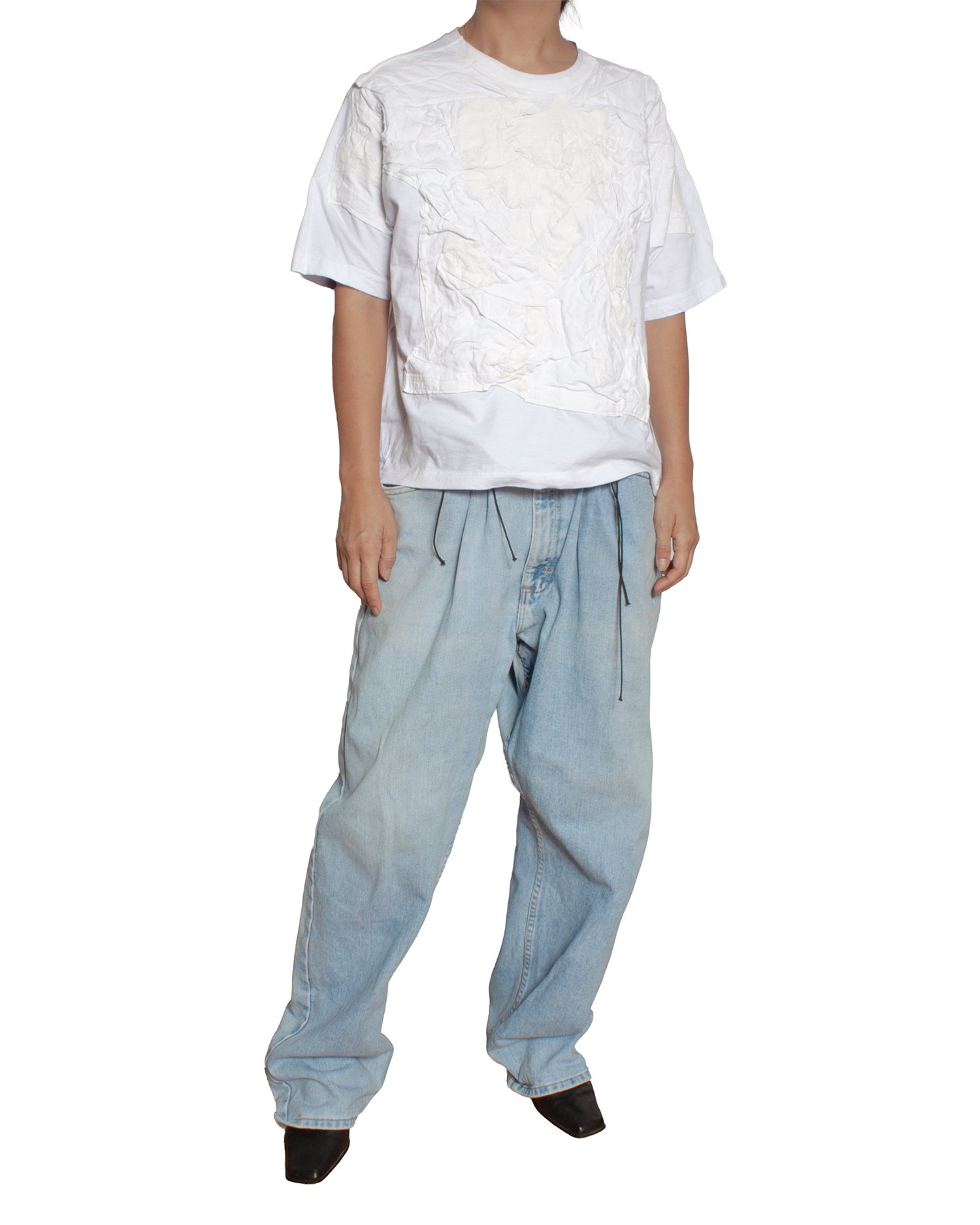 Camiseta branca com aplicação frontal em tecido manipulado, gerando volume e textura. Modelagem reta. Acabamento manual.