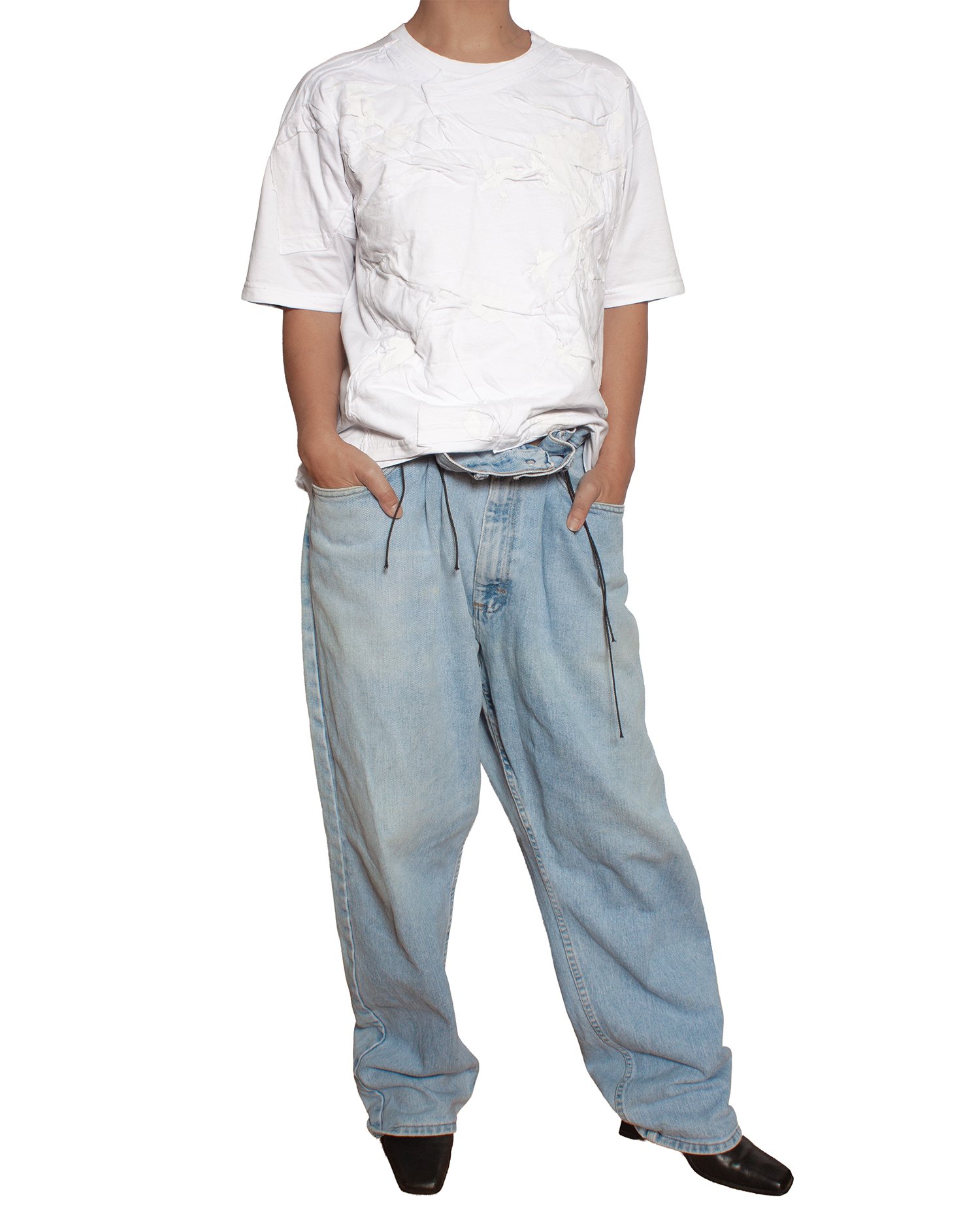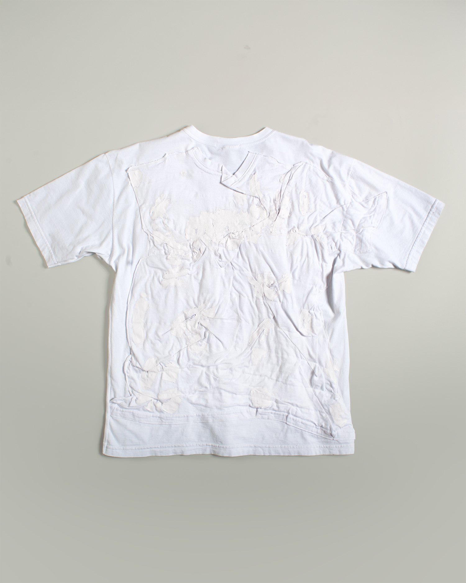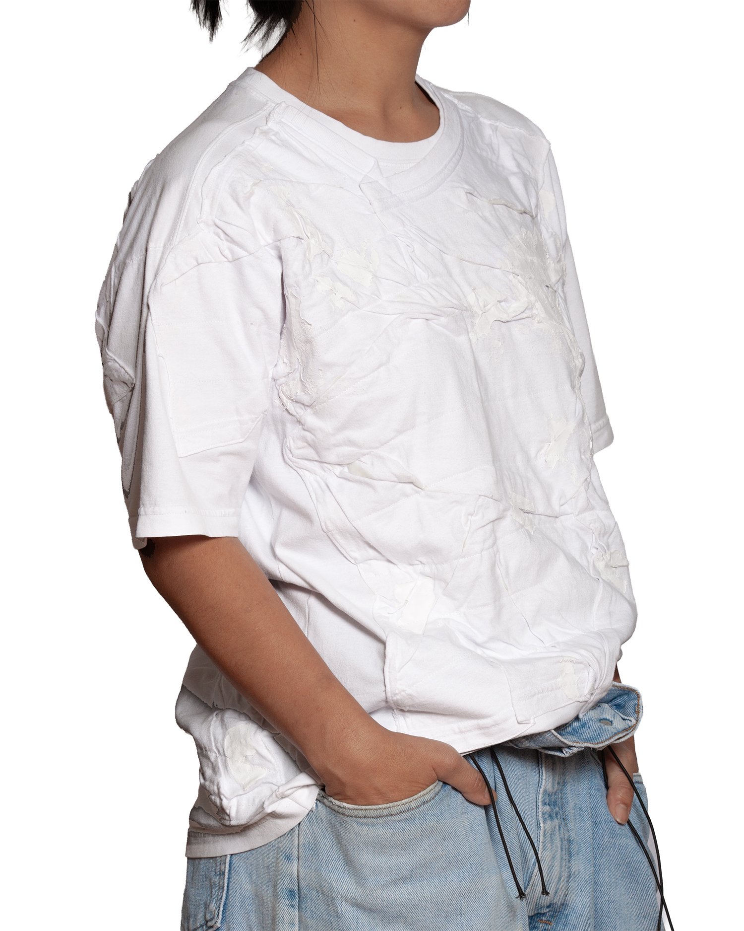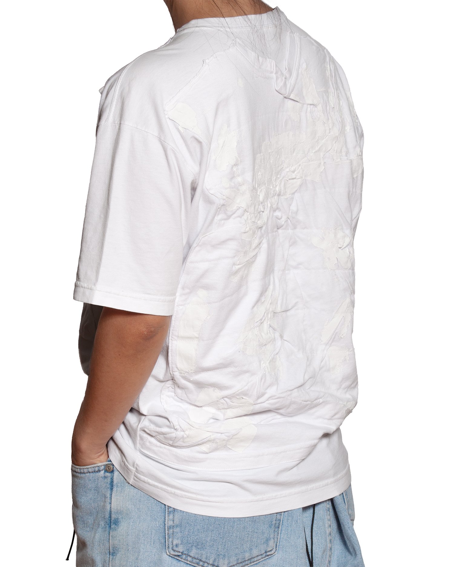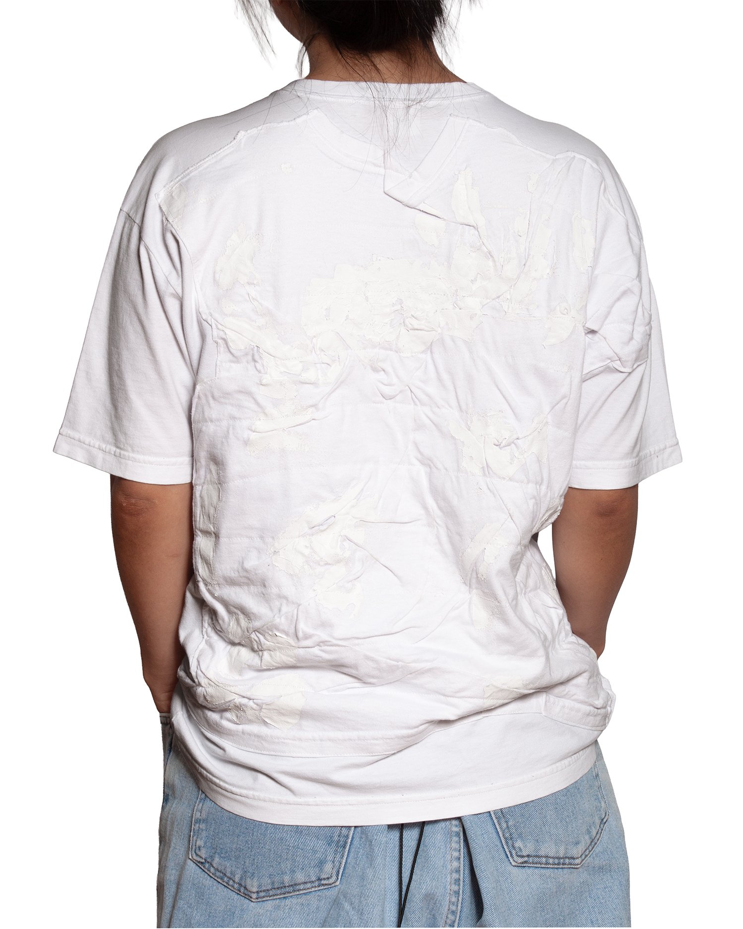 Camiseta branca com aplicação frontal em tecido manipulado, gerando volume e textura. Modelagem reta. Acabamento manual.