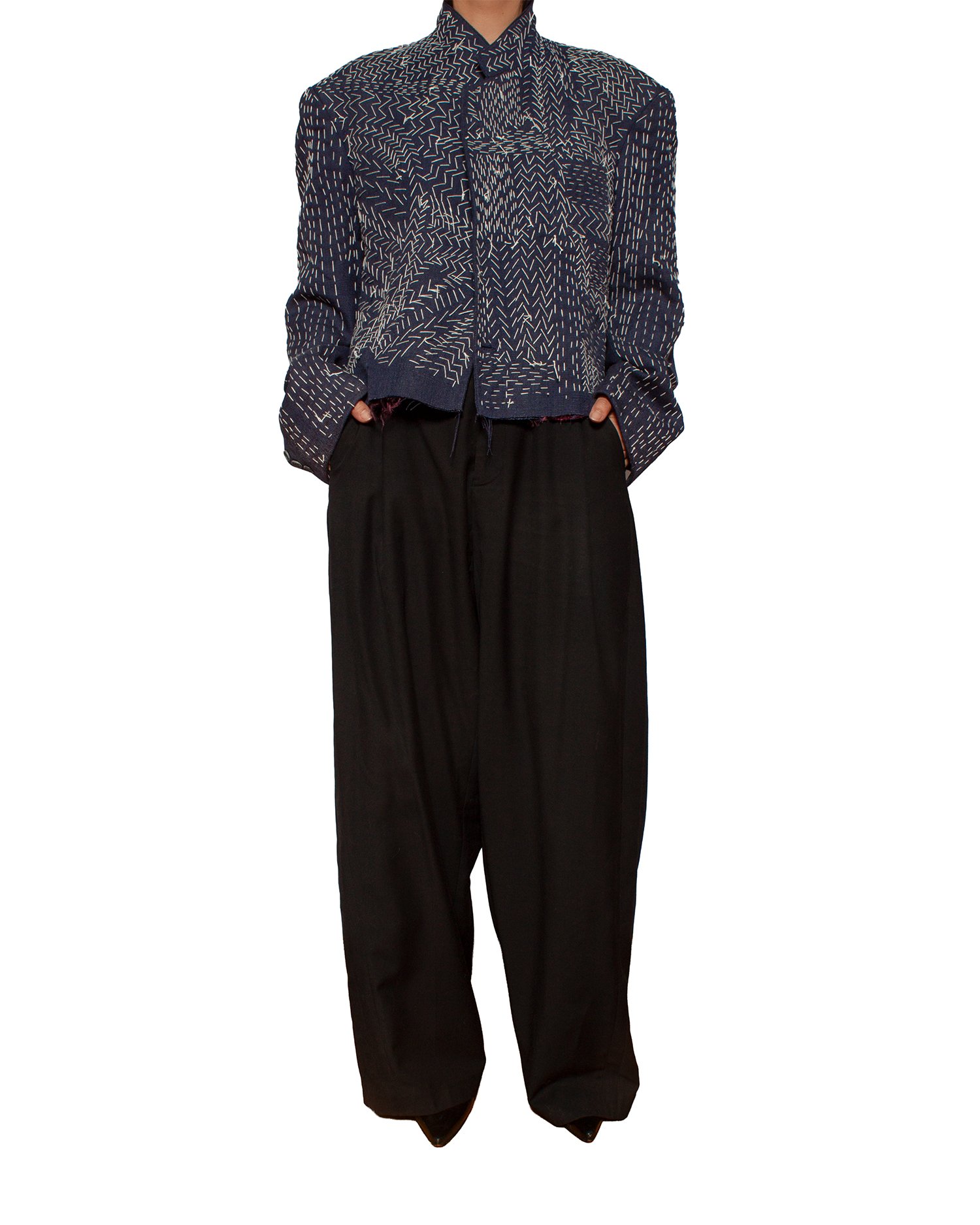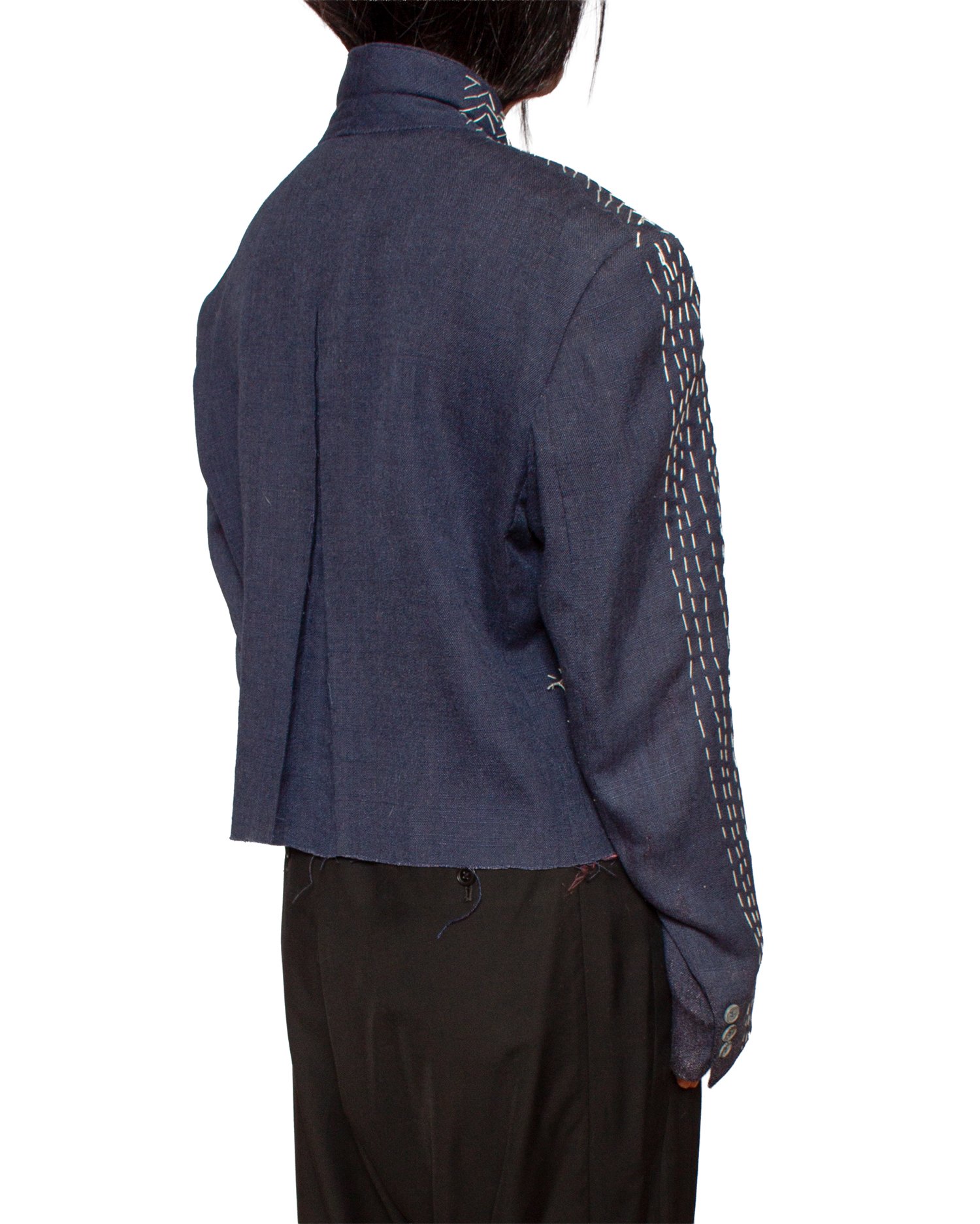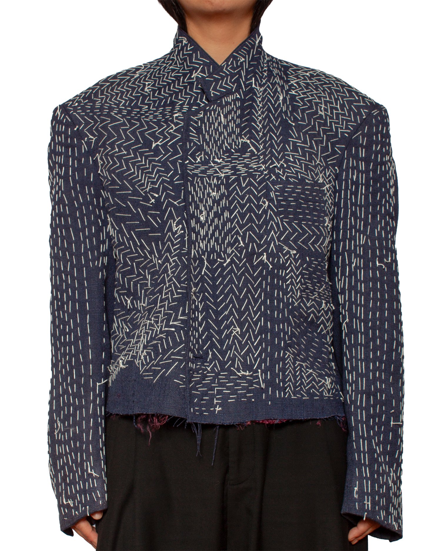 Jaqueta boxy cortada no fio, tecido antigo de linho com poliéster, forro de acetato, bordado na mao, estilo sashiko, com linha de algodão branco. Fechamento com colchete de metal.
