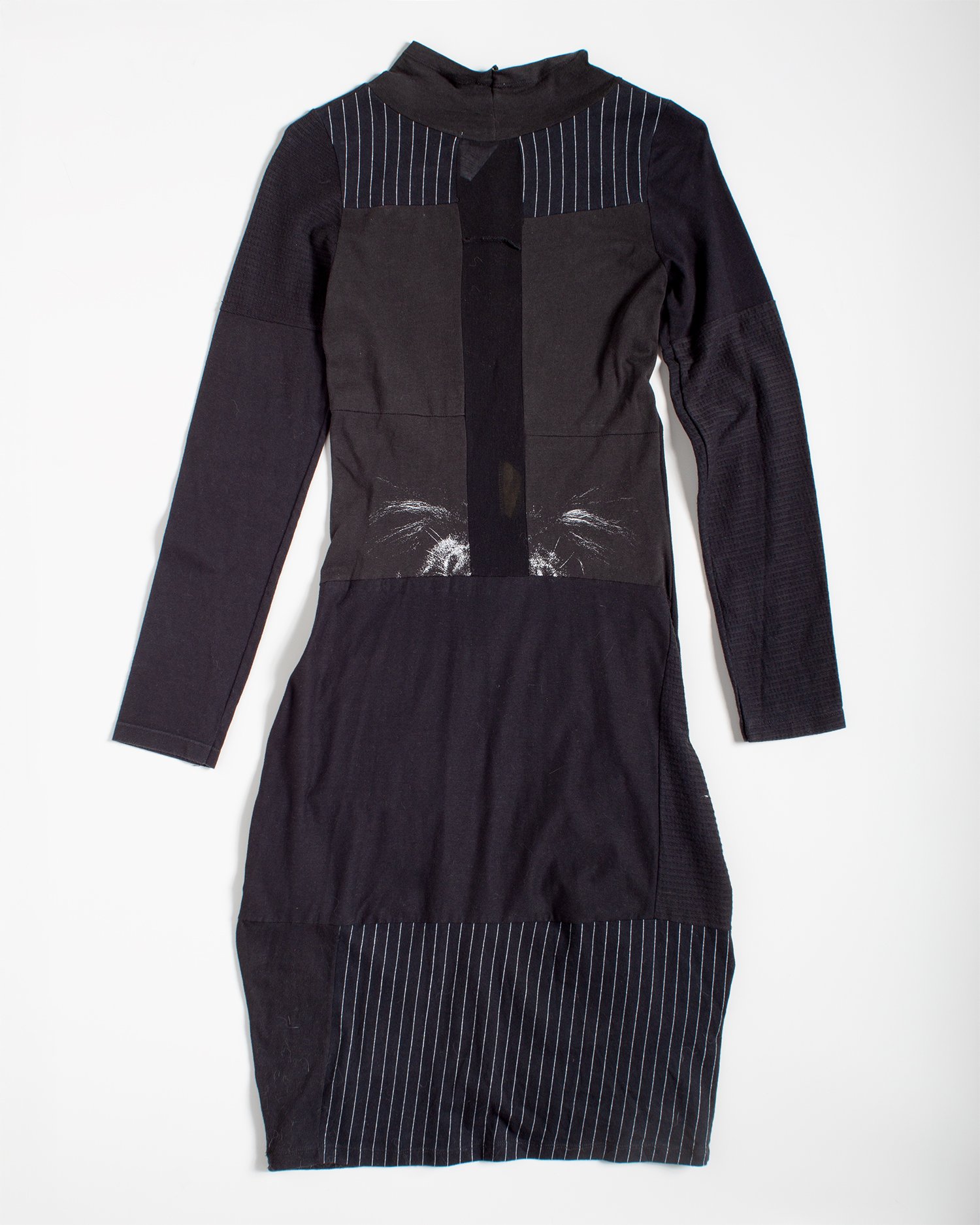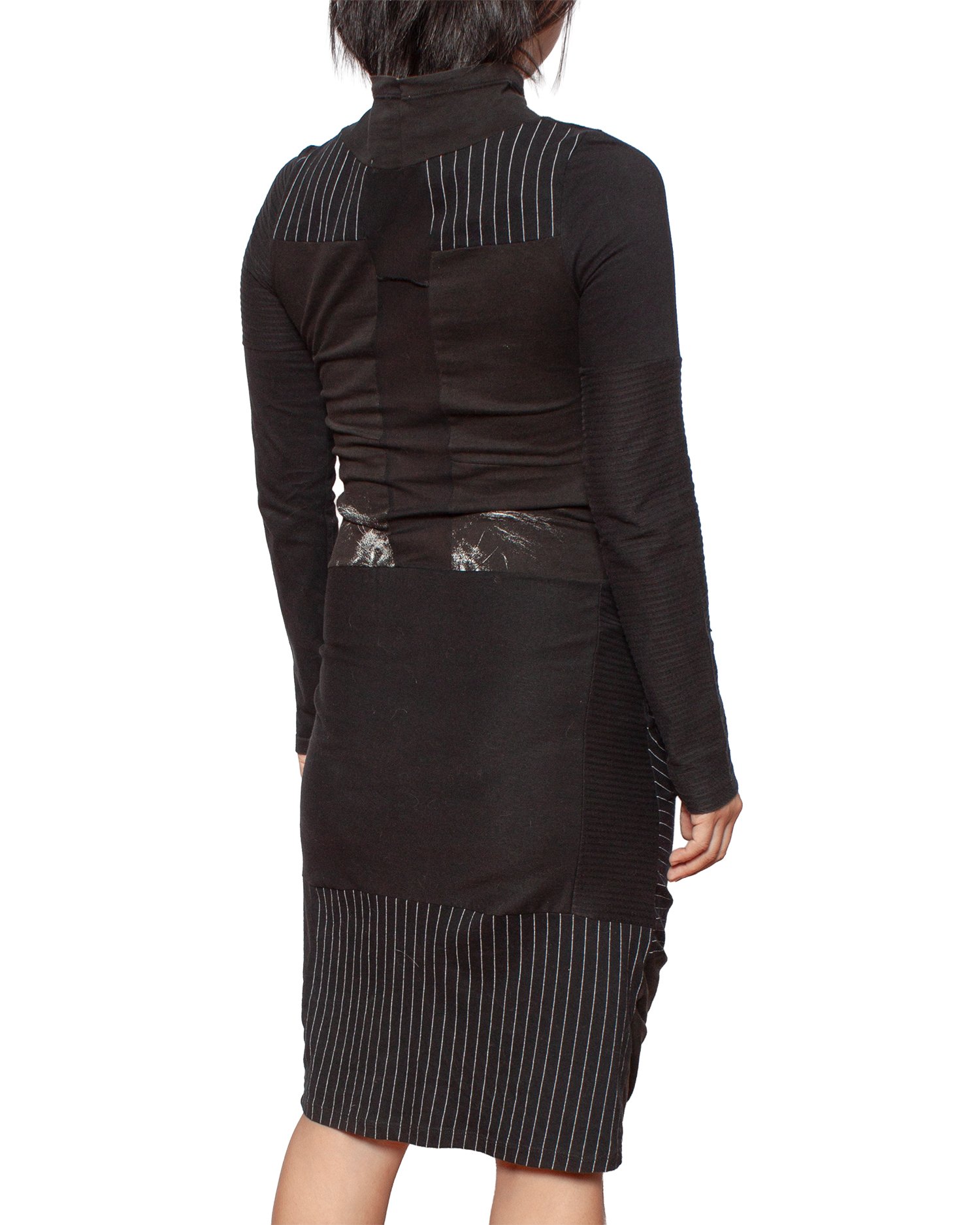 Vestido confeccionado a partir de camisetas pretas, com construção ajustada ao corpo e franzidos contínuos. Intervenções manuais aparentes e variação sutil de textura. Manga longa e gola alta. Acabamento artesanal.